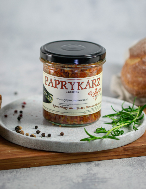 Delikatny i szlachetny w smaku. Dorsz nadaje paprykarzowi lekkości i subtelności, zachowując przy tym klasyczny charakter szczecińskiej receptury. To połączenie morskiej świeżości z tradycją, która trwa od pokoleń.